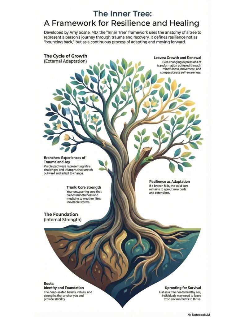 The trunk represents Amy’s unwavering core—the ability to weather storms while standing strong. Her work blends medicine, education, and mindfulness, offering a trauma-informed approach that helps individuals and communities build strength and adaptability.